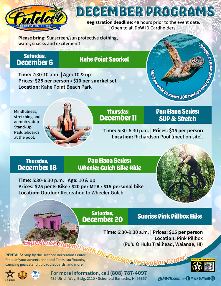 For more information, call Outdoor Recreation Center at (808) 787-4097