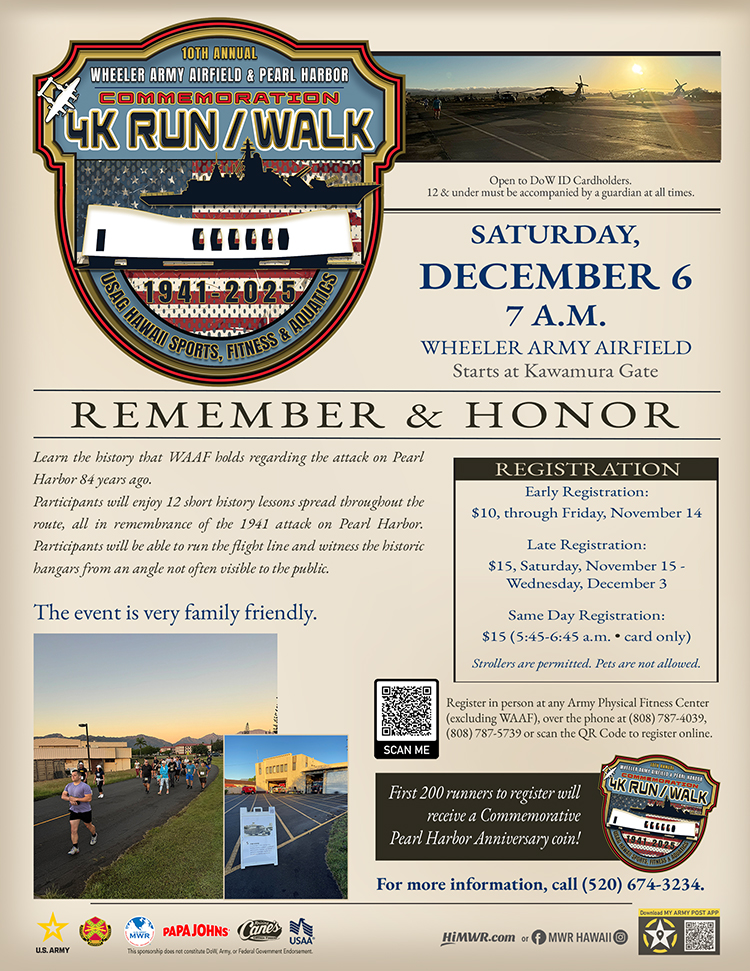 Participants will enjoy 12 short history lessons spread throughout the route, all in remembrance of the 1941 attack on Pearl Harbor. Participants will be able to run the flight line and witness the historic hangars from an angle not often visible to the public.