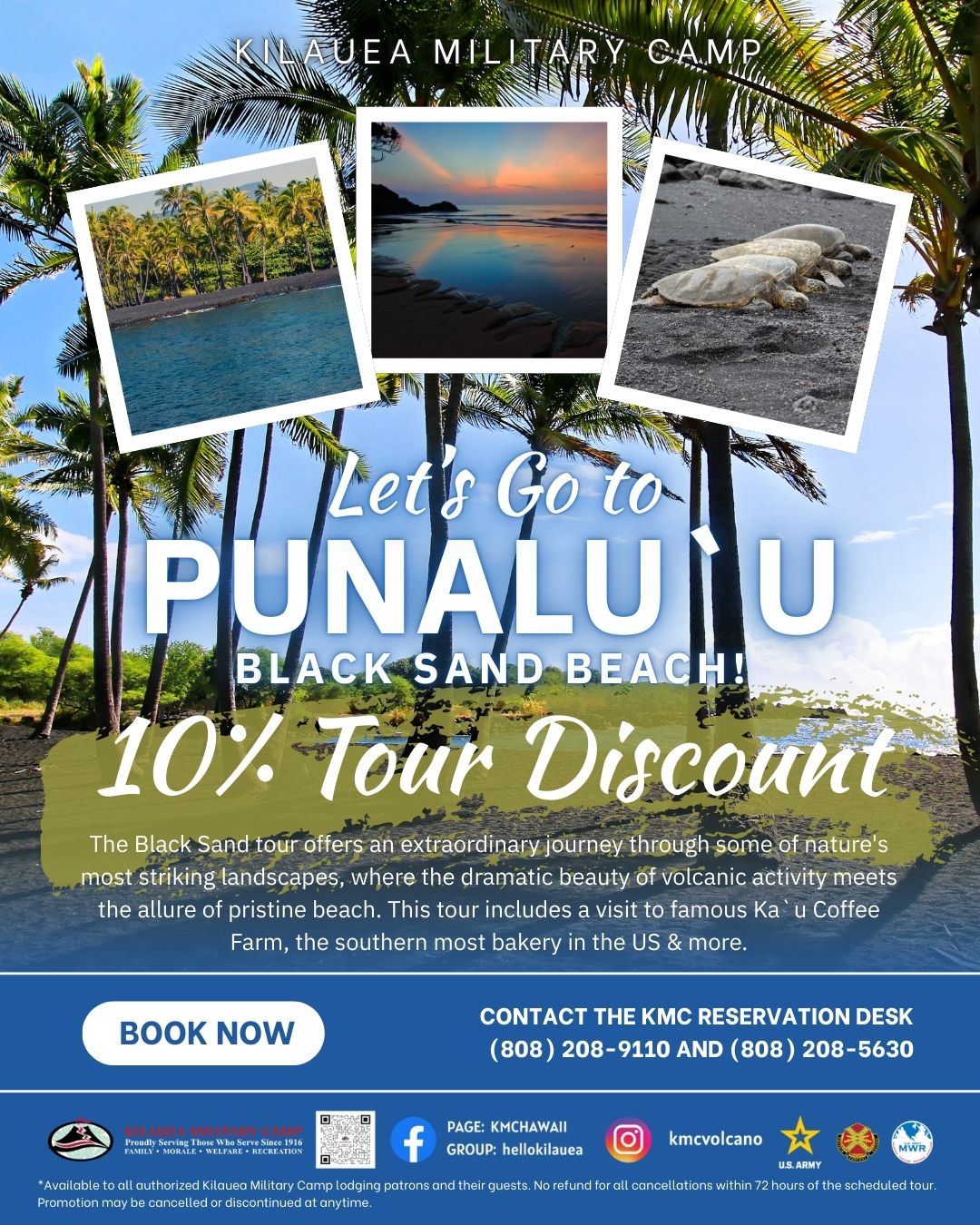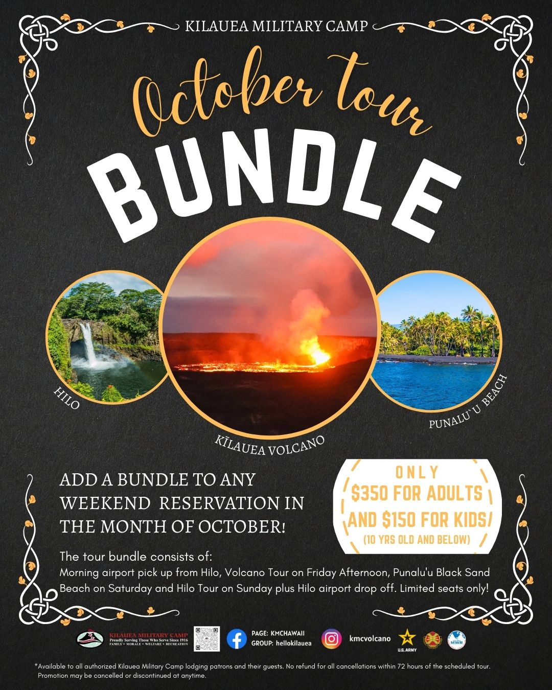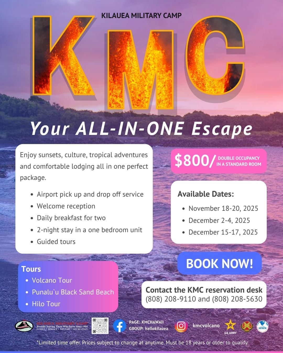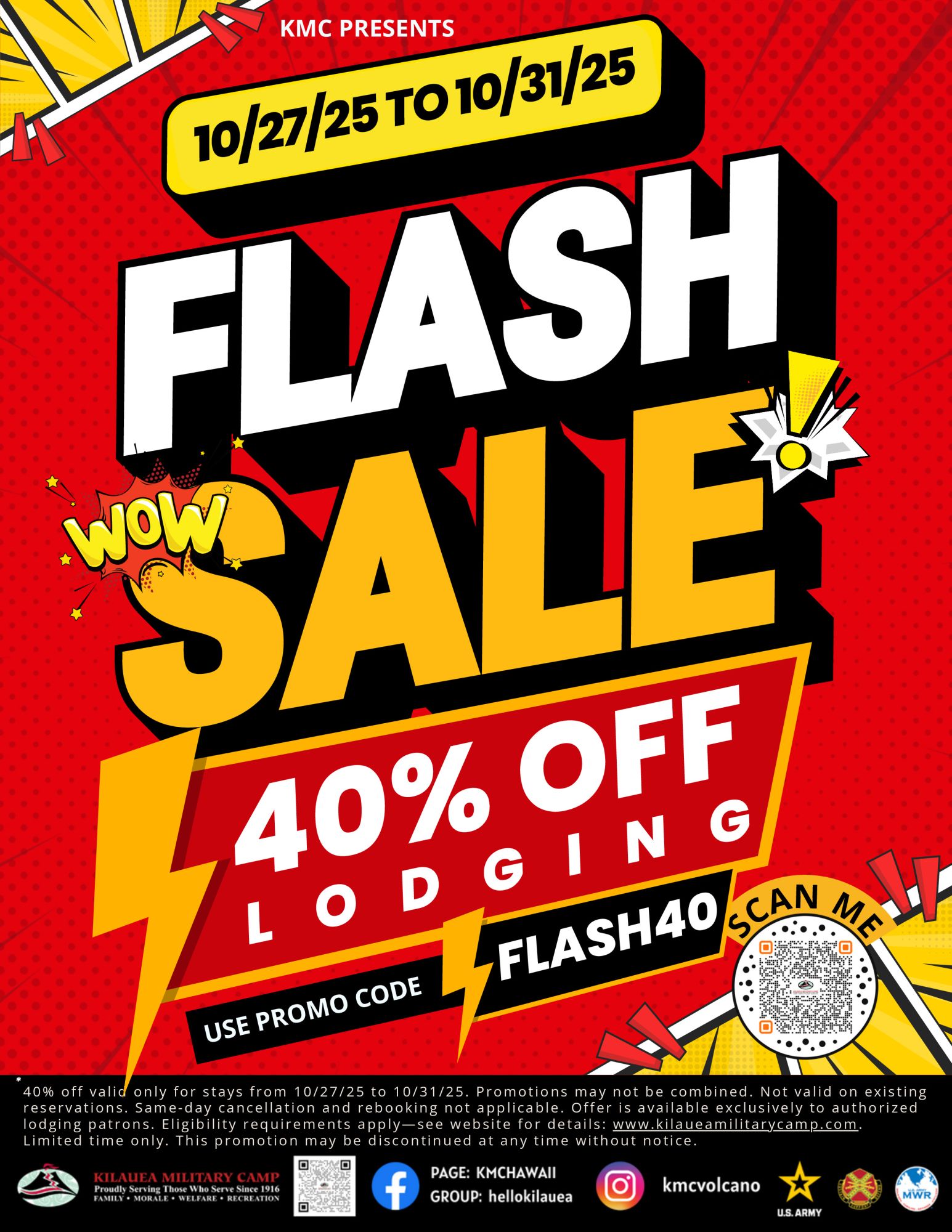 *40% off valid only for stays from 10/27/25 to 10/31/25. Promotions may not be combined. Not valid on existing reservations. Same-day cancellation and rebooking not applicable. Offer is available exclusively to authorized lodging patrons. Eligibility requirements apply—see website for details: www.kilaueamilitarycamp.com. Limited time only. This promotion may be discontinued at any time without notice.
