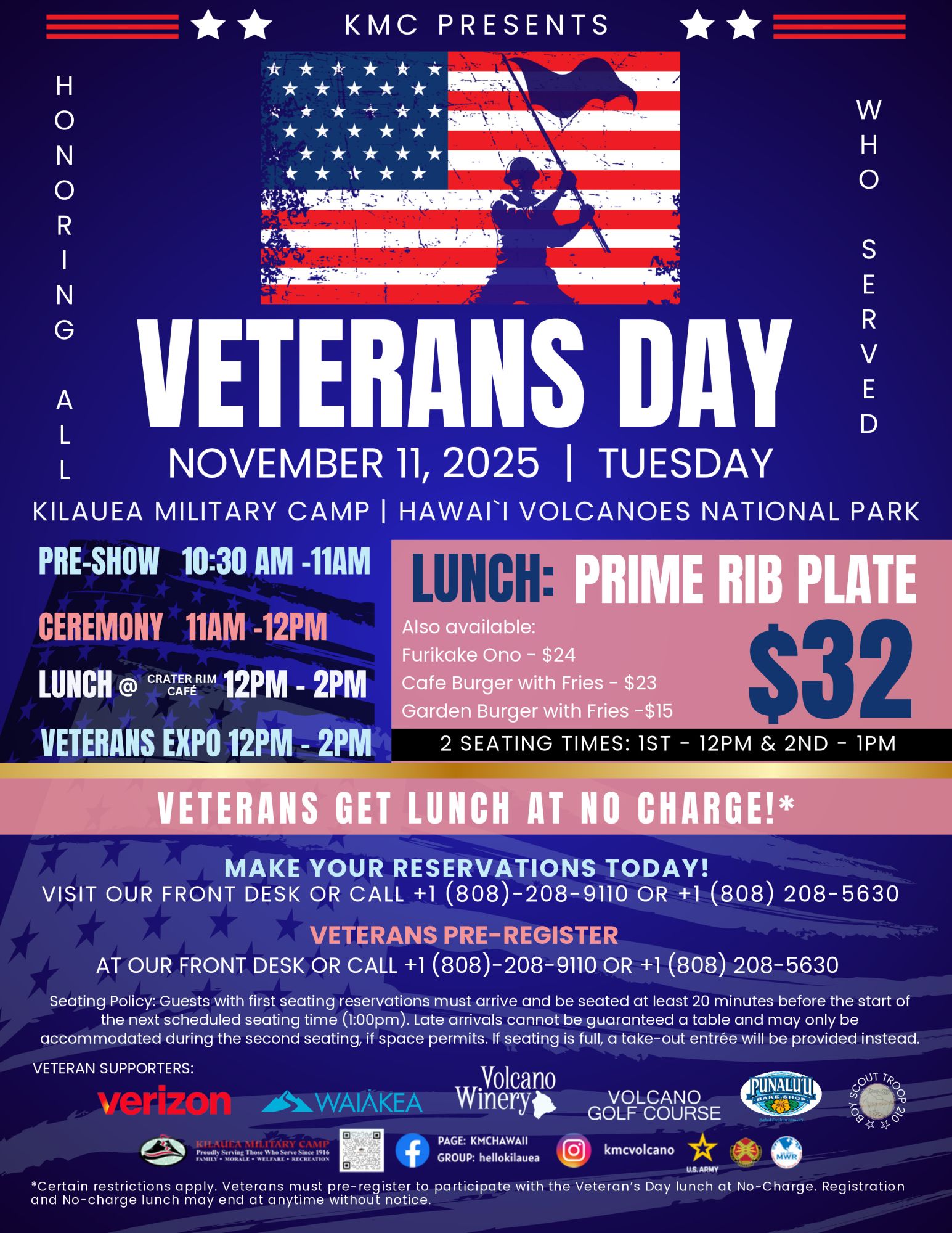 Special thanks to our Veteran supporters: Verizon, Waiākea, Volcano Winery, Volcano Golf Course, Punalu`u Bake Shop, and Boy Scout Troop 210.**Certain restrictions apply. Veterans must pre-register for the no-charge lunch. Offer may end without notice.