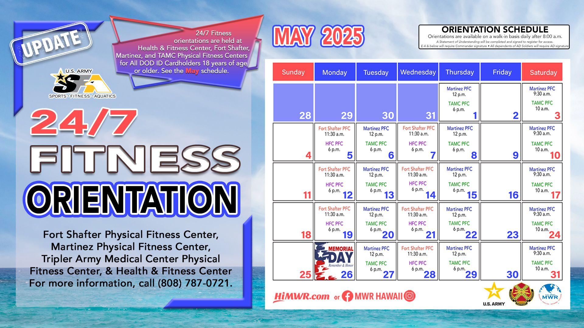 All DOD ID cardholders 18 years of age and older are allowed to have around the clock access to the Fort Shafter, Martinez, Tripler Physical Fitness Centers and Lee Health and Fitness Center.  Prior to authorization a mandatory orientation is required. Orientations can be attended at Fort Shafter PFC, Martinez PFC, TAMC PFC, and Lee Health and Fitness Center.